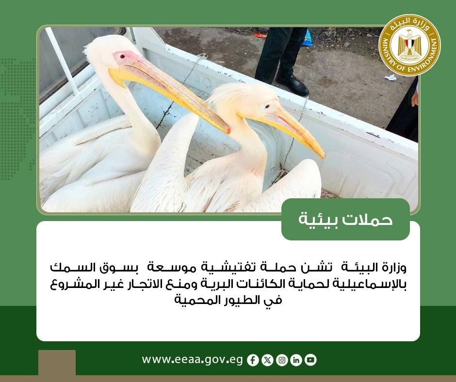 -تنفيذًا لتوجيهات الدكتورة منال عوض وزيرة التنمية المحلية والقائم بأعمال وزير البيئة، نفذت وزارة البيئة من خلال فرع جهاز شئون البيئة بالشرقية والإسماعيلية حملة تفتيشية بسوق السمك بالإسماعيلية بالتنسيق مع شرطة البيئة والمحافظة، تم خلالها مصادرة عدد 2 بجعة كانت معروضة بالمخالفة للقوانين المنظمة لحماية الكائنات البرية.