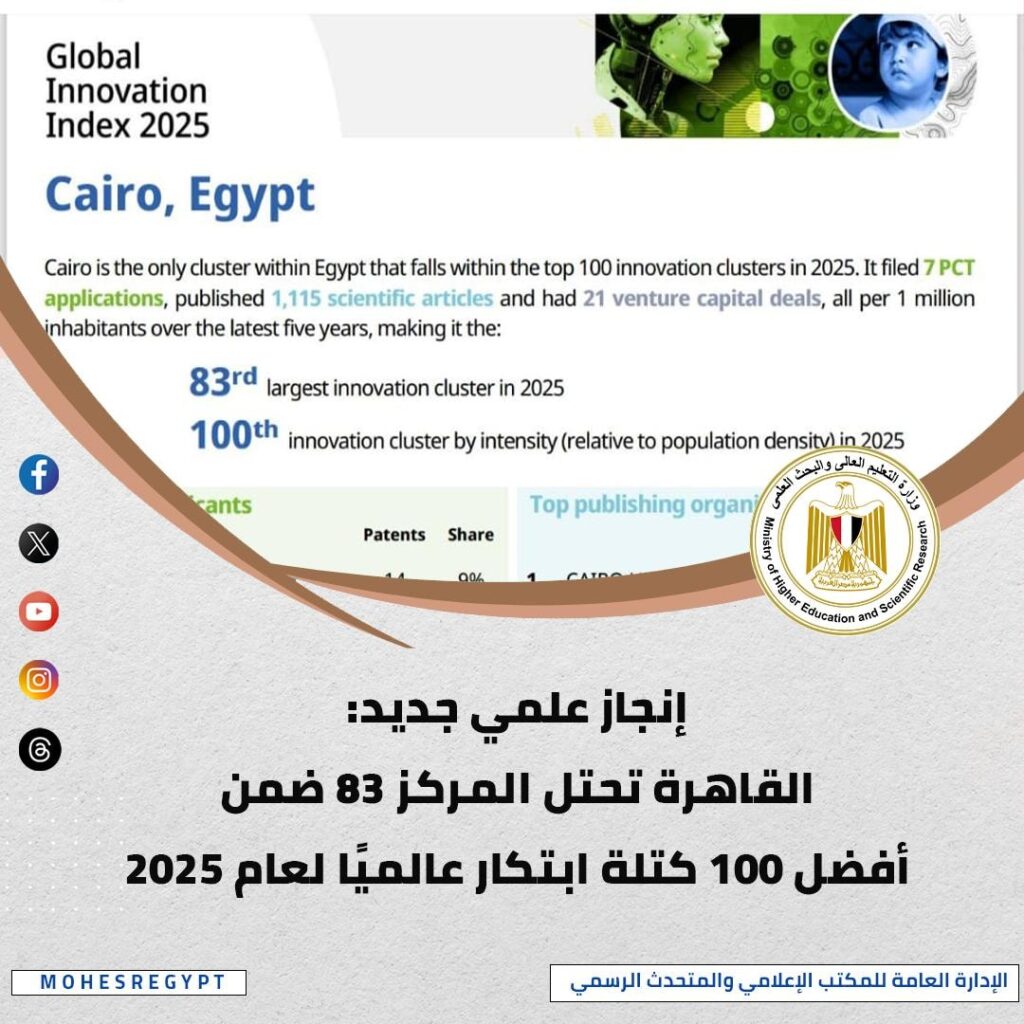 أعلنت نتائج مؤشر الابتكار العالمي لعام 2025 أن مدينة القاهرة احتلت المركز 83 من حيث الحجم ضمن أكبر 100 كتلة ابتكار عالميًا، محققة قفزة نوعية، مقارنة بنتائج المؤشر لعام 2024 التي جاءت خلاله في المركز 95، وذلك لأول مرة ضمن أكبر 100 كتلة ابتكار عالميًا، وأوضح الدكتور أيمن عاشور أن الوزارة تعمل على تعزيز دور المؤسسات التعليمية والبحثية كمؤسسات ابتكارية، وتهيئة بيئة جاذبة ومحفزة للتعاون بين المؤسسات التعليمية والبحثية ومجتمع الصناعة، وفي هذا الإطار أصدرت الوزارة السياسة الوطنية للابتكار المستدام 2030 في فبراير 2025.