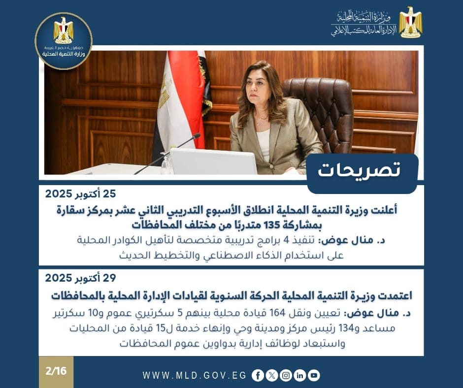 أعلنت الدكتورة منال عوض، وزيرة التنمية المحلية عن إنطلاق فعاليات الأسبوع التدريبي الثاني عشر من الخطة التدريبية لمركز التنمية المحلية بسقارة لعام 2025 / 2026، والذي يُعقد خلال الفترة من 26 إلى 29 أكتوبر 2025، ويتضمن تنفيذ 4 برامج تدريبية متخصصة بمشاركة 135 متدربًا من مختلف المحافظات.