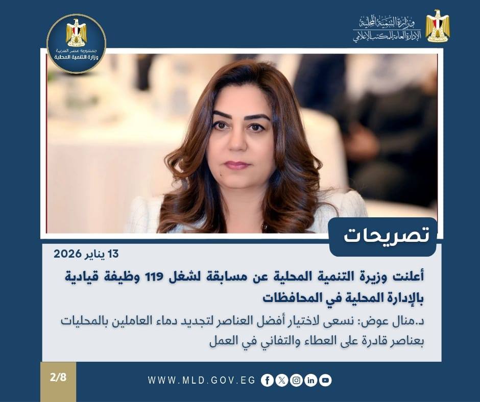 أعلنت الدكتورة منال عوض وزيرة التنمية المحلية عن مسابقة جديدة لشغل ( 119 ) وظيفة بمجموعة الوظائف القيادية بالإدارة المحلية بالمحافظات (سكرتير عام وسكرتير مساعد ورؤساء مراكز وأحياء ومدن) وسيفتح باب التقديم الالكتروني للمسابقة لمدة شهر وفقاً للضوابط المنصوص عليها بقانون الخدمة المدنية رقم 81 لسنة 2016 ولائحته التنفيذية .