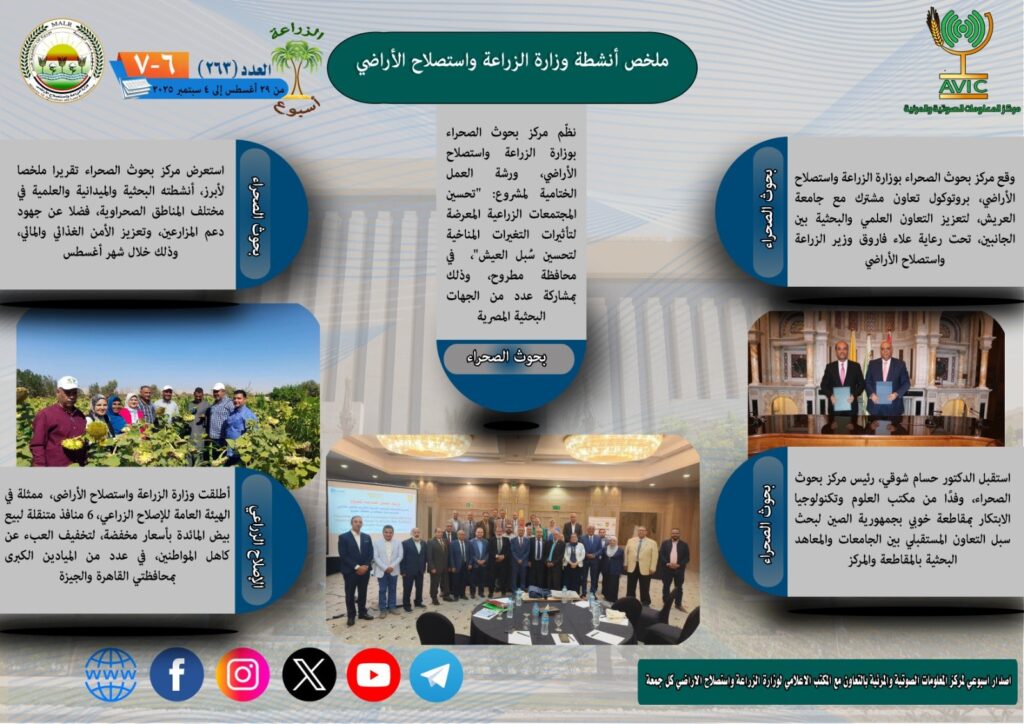 ووقع مركز بحوث الصحراء بوزارة الزراعة واستصلاح الأراضي، بروتوكول تعاون مشترك مع جامعة العريش، لتعزيز التعاون العلمي والبحثية بين الجانبين، تحت رعاية علاء فاروق وزير الزراعة واستصلاح الأراضي، كما استعرض المركز تقريرا ملخصا لأبرز، أنشطته البحثية والميدانية والعلمية في مختلف المناطق الصحراوية، فضلا عن جهود دعم المزارعين، وتعزيز الأمن الغذائي والمائي، وذلك خلال شهر أغسطس، كذلك نظم ورشة العمل الختامية لمشروع: “تحسين المجتمعات الزراعية المعرضة لتأثيرات التغيرات المناخية لتحسين سُبل العيش”، في محافظة مطروح، وذلك بمشاركة عدد من الجهات البحثية المصرية، كما استقبل الدكتور حسام شوقي، رئيس مركز بحوث الصحراء، وفدًا من مكتب العلوم وتكنولوجيا الابتكار بمقاطعة خوبي بجمهورية الصين لبحث سبل التعاون المستقبلي بين الجامعات والمعاهد البحثية بالمقاطعة والمركز.