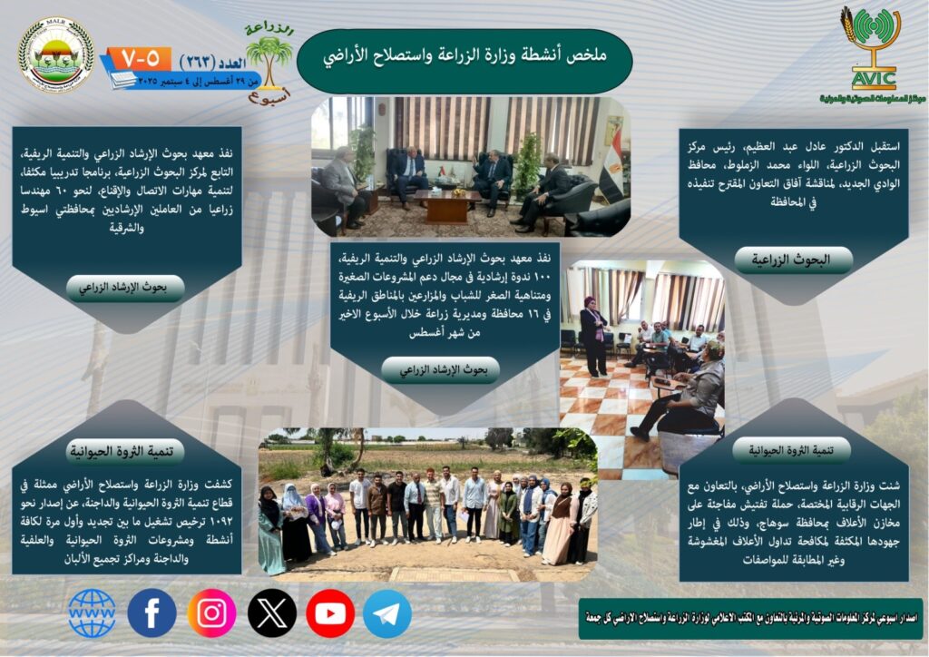 أصدر مركز المعلومات الصوتية والمرئية بوزارة الزراعة واستصلاح الأراضي، “الانفوجراف الاسبوعي” في نسخته رقم 263 حول الحصاد الاسبوعي لأهم أنشطة الوزارة، خلال الاسبوع الماضي في الفترة من 29 اغسطس وحتى 4 سبتمبر الجاري، كما أصدر المركز ايضا ملخصا بالفيديو، حول انشطة الوزارة خلال نفس الفترة.