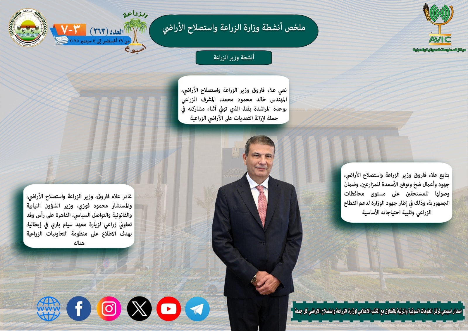 وخلال هذا الأسبوع وقع علاء فاروق وزير الزراعة واستصلاح الأراضي، وعبدالله بن حمد بن عبدالله العطية وزير البلدية بدولة قطر مذكرة تفاهم لتعزيز التعاون في المجالات المرتبطة بالقطاع الزراعي والأمن الغذائي، كما شهد وزير الزراعة، حفل تخرج دفعة جديدة من خريجي فرع الأكاديمية العربية للعلوم والتكنولوجيا والنقل البحري بمدينة العلمين، وذلك نيابة عن الدكتور مصطفى مدبولي رئيس مجلس الوزراء.