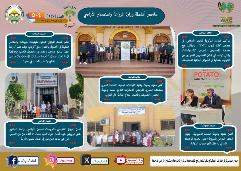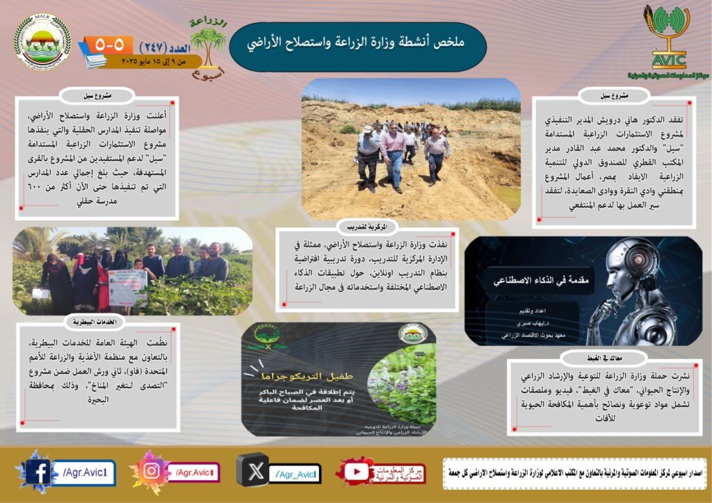 أصدر مركز المعلومات الصوتية والمرئية بوزارة الزراعة واستصلاح الأراضي، “الانفوجراف الاسبوعي” في نسخته رقم 247 حول الحصاد الاسبوعي لأهم أنشطة الوزارة، خلال الاسبوع الماضي في الفترة من 9 وحتى 15 مايو الجاري، كما أصدر المركز ايضا ملخصا بالفيديو، حول انشطة الوزارة خلال نفس الفترة.