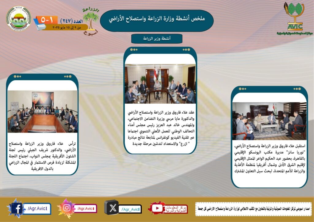 وخلال هذا الأسبوع استقبل علاء فاروق وزير الزراعة واستصلاح الأراضي، “نوريا سانز” مديرة مكتب اليونسكو الإقليمي بالقاهرة، بحضور عبد الحكيم الواعر الممثل الإقليمي لإقليم الشرق الأدنى وشمال أفريقيا لمنظمة الأغذية والزراعة للأمم المتحدة، لبحث سبل التعاون المشترك، كما عقد وزير الزراعة، وزيرة التضامن الاجتماعي، رئيس مجلس أمناء التحالف الوطني للعمل الأهلي التنموي اجتماعا عبر تقنية الفيديو كونفرانس لمتابعة نتائج مبادرة ” ازرع” والاستعداد لتدشين مرحلة جديدة