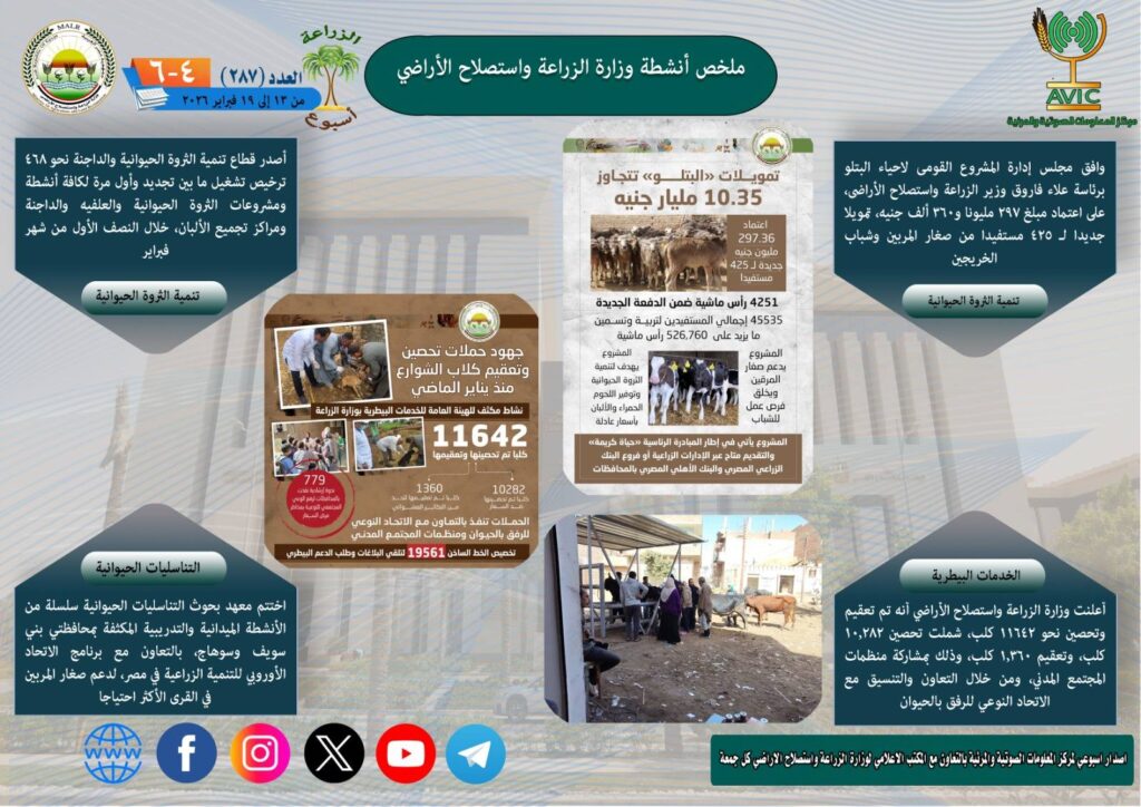 أصدر مركز المعلومات الصوتية والمرئية بوزارة الزراعة واستصلاح الأراضي، “الانفوجراف الاسبوعي” في نسخته رقم 287 حول الحصاد الاسبوعي لأهم أنشطة الوزارة، خلال الاسبوع الماضي في الفترة من 13 وحتى 19 فبراير الجاري، كما أصدر المركز ايضا ملخصا بالفيديو، حول انشطة الوزارة خلال نفس الفترة.