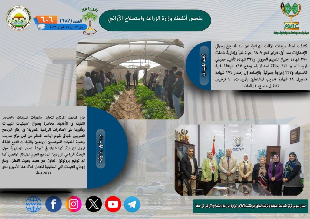 وقدم المعمل المركزي لتحليل متبقيات المبيدات والعناصر الثقيلة في الأغذية، محاضرة بعنوان “متبقيات المبيدات وتأثيرها على الصادرات الزراعية المصرية” فى إطار البرنامج التدريبى المجانى لليوم الواحد المنظم من قبل مركز تدريب وتنمية القدرات للمهندسين الزراعيين والقيادات التابع لنقابة المهن الزراعية، كما شارك في “ورشة العمل الاسفيرية حول البحث الزراعي الريادي” البرنامج العربي للابتكار الاخضر، كما تم توقيع بروتوكول تعاون مع معهد بحوث القطن، وبلغ إجمالي العينات التي استقبلها المعمل خلال هذا الأسبوع نحو 8566 عينة.