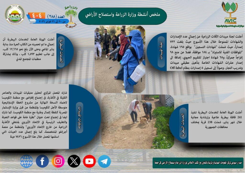 يذكر ان مركز المعلومات الصوتية والمرئية، والمكتب الاعلامي للوزارة، يصدران الجمعة من كل اسبوع، انفوجرافا وفيديو باسم: الزراعة في اسبوع، لالقاء الضوء على ملخص ما تم من انشطة وجهود، بكافة القطاعات والهيئات، التابعة للوزارة.