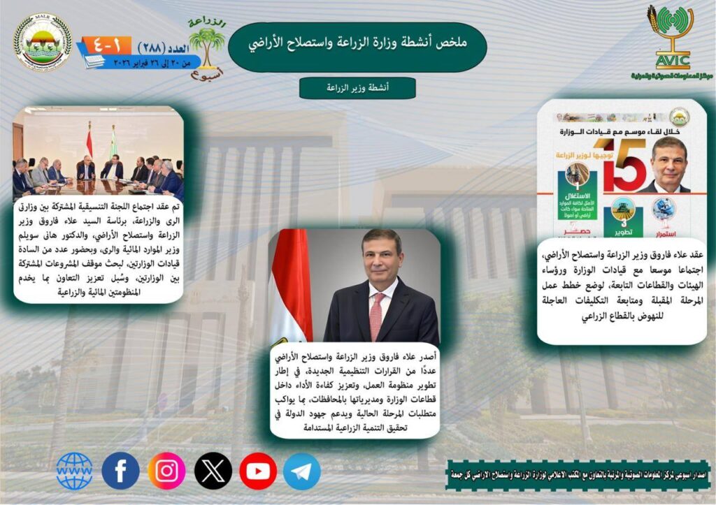 وخلال هذا الاسبوع عقد علاء فاروق وزير الزراعة واستصلاح الأراضي، اجتماعا موسعا مع قيادات الوزارة ورؤساء الهيئات والقطاعات التابعة، لوضع خطط عمل المرحلة المقبلة ومتابعة التكليفات العاجلة للنهوض بالقطاع الزراعي، كما أصدر وزير الزراعة، عددًا من القرارات التنظيمية الجديدة، في إطار تطوير منظومة العمل، وتعزيز كفاءة الأداء داخل قطاعات الوزارة ومديرياتها بالمحافظات، بما يواكب متطلبات المرحلة الحالية ويدعم جهود الدولة في تحقيق التنمية الزراعية المستدامة.