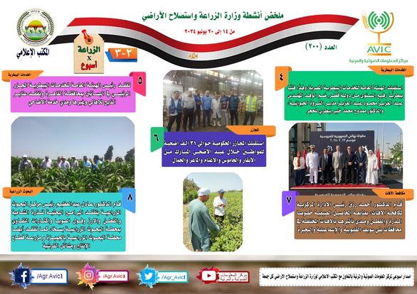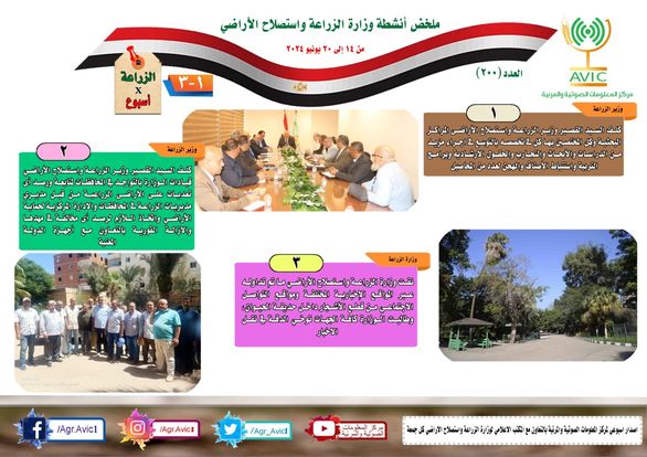 يذكر أن مركز المعلومات الصوتية والمرئية، والمكتب الاعلامي للوزارة، يصدران الجمعة من كل أسبوع، انفوجرافا باسم: الزراعة في أسبوع، لإلقاء الضوء على ملخص ما تم من أنشطة وجهود، بكافة القطاعات والهيئات، التابعة للوزارة، فضلا عن إنفوجراف وفيديو كل ثلاثاء باسم: الزراعة في كل مصر، حول انشطة وجهود القطاع الزراعي، بالمحافظات المختلفة،