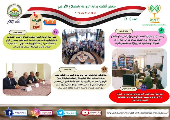 أصدر مركز المعلومات الصوتية والمرئية، التابع لوزارة الزراعة واستصلاح الأراضي، “الإنفوجراف الأسبوعي” في نسخته رقم 200 حول الحصاد الأسبوعي لأهم أنشطة الوزارة.