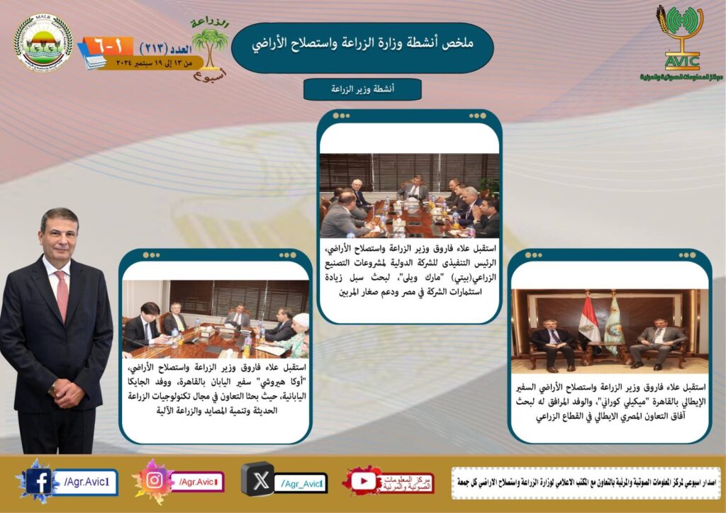 وسلط الانفوجراف الضوء على عدد من اللقاءات التي عقدها علاء فاروق وزير الزراعة واستصلاح الأراضي، حيث استقبل السفير الإيطالي بالقاهرة “ميكيلي كوراني”، والوفد المرافق له لبحث آفاق التعاون المصري الايطالي في القطاع الزراعي، كما استقبل أيضا الرئيس التنفيذى للشركة الدولية لمشروعات التصنيع الزراعي(بيتي) “مارك ويلى”، لبحث سبل زيادة استثمارات الشركة في مصر ودعم صغار المربين.