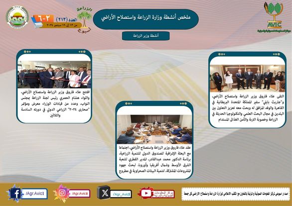 وعقد “فاروق”، اجتماعا مع البعثة الإشرافية للصندوق الدولى للتنمية الزراعية، برئاسة الدكتور محمد عبدالقادر، المدير القطري لشعبة الشرق الأوسط وشمال أفريقيا وأوروبا، لبحث جهود المشروعات المشتركة، لتنمية البيئات الصحراوية في مطروح، كما افتتح وزير الزراعة، ورئيس لجنة الزراعة بمجلس النواب، وعدد من قيادات الوزراء معرض ومؤتمر “صحارى 2024” الزراعي الدولي في دورته السادسة والثلاثين، كما عقدا علاء فاروق وزير الزراعة واستصلاح الأراضي والدكتور شريف فاروق وزير التموين والتجارة الداخلية عدة اجتماعات مع بعض منتجى بيض المائدة لبحث استقرار الأسواق وتوفيره بأسعار مخفضة للمواطنين.