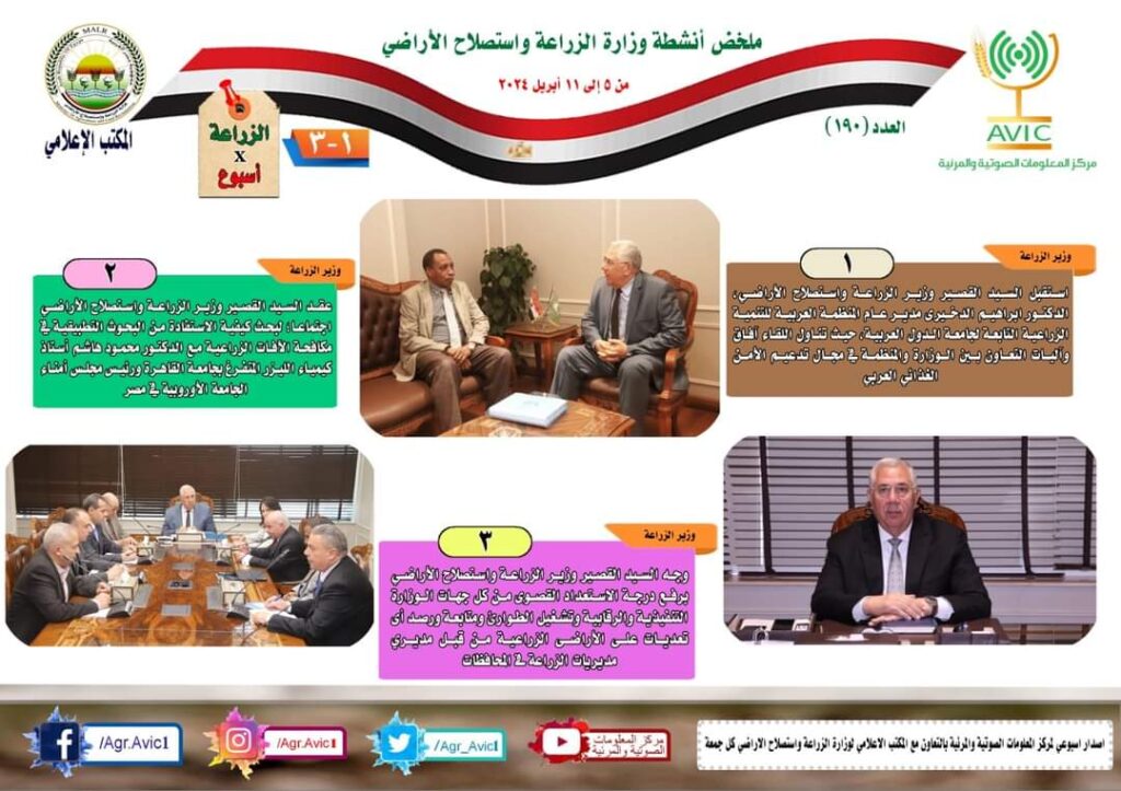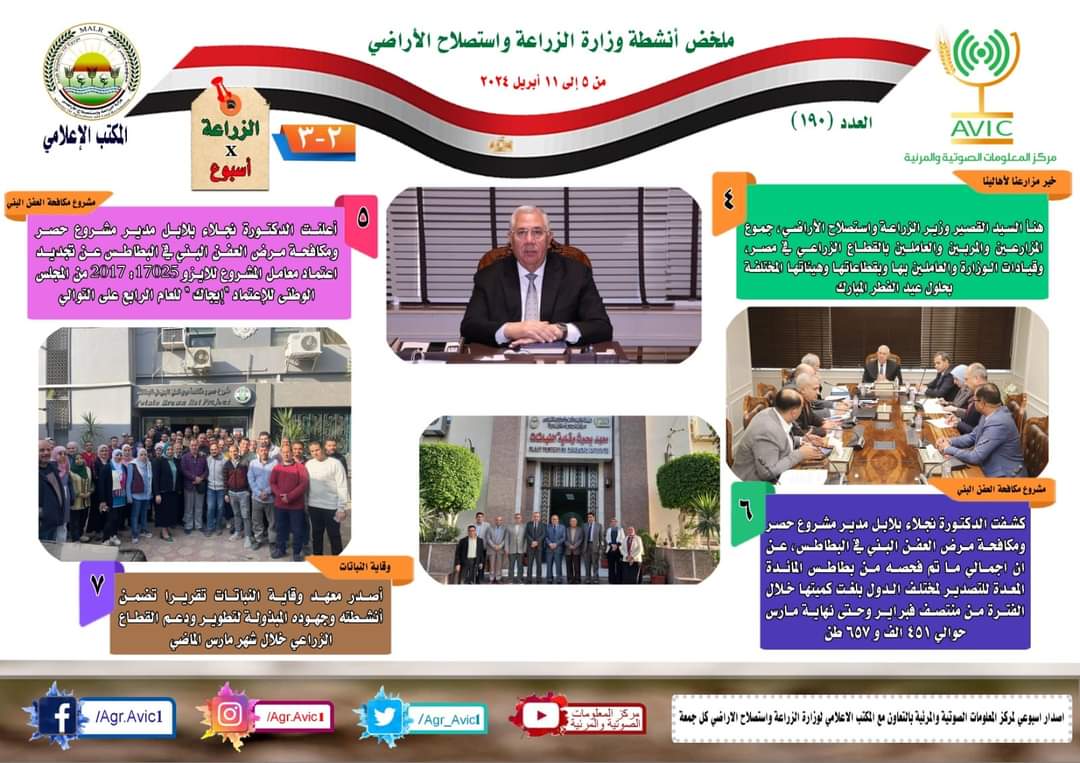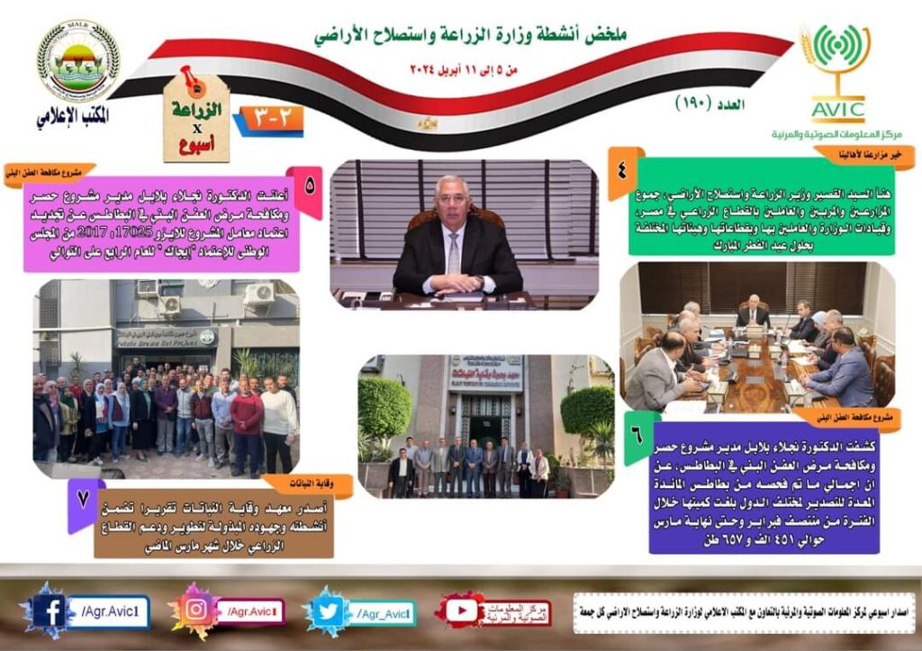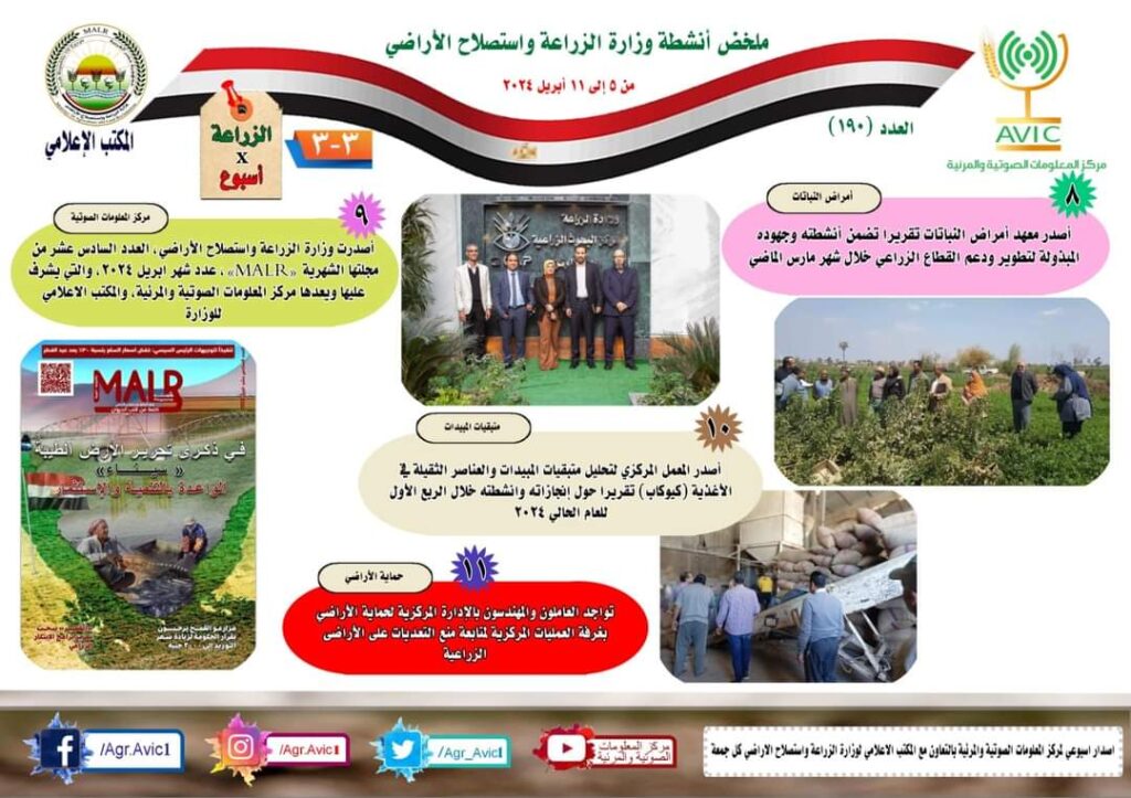 أصدر مركز المعلومات الصوتية والمرئية، التابع لوزارة الزراعة واستصلاح الاراضي، “الانفوجراف الاسبوعي” في نسخته رقم ١٩٠ حول الحصاد الاسبوعي لأهم أنشطة الوزارة، خلال الاسبوع الماضي في الفترة من ٥ وحتى ١١ أبريل الجاري، وذلك بالتعاون مع المكتب الاعلامي للوزارة، كما أصدر المركز ايضا ملخصا بالفيديو، حول انشطة الوزارة خلال نفس الفترة.