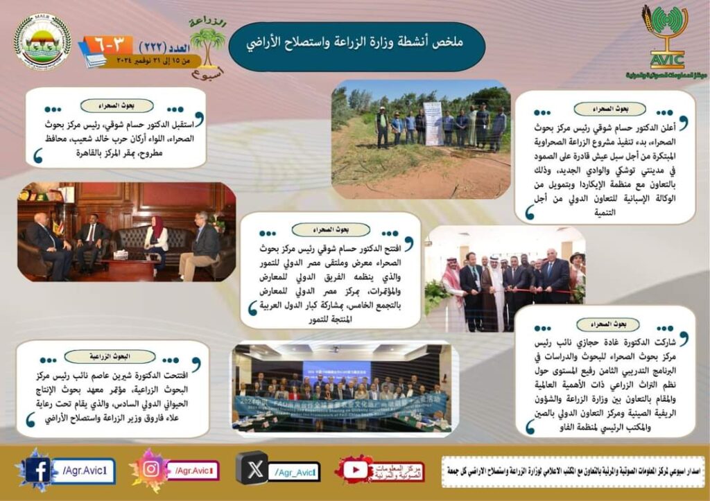 بينما أعلن الدكتور حسام شوقي رئيس مركز بحوث الصحراء، بدء تنفيذ مشروع الزراعة الصحراوية المبتكرة من أجل سبل عيش قادرة على الصمود في مدينتي توشكي والوادي الجديد، وذلك بالتعاون مع منظمة الإيكاردا وبتمويل من الوكالة الإسبانية للتعاون الدولي من أجل التنمية، كما استقبل رئيس المركز، اللواء أركان حرب خالد شعيب، محافظ مطروح، بمقر المركز بالقاهرة، كذلك افتتح معرض وملتقى مصر الدولي للتمور والذي ينظمه الفريق الدولي للمعارض والمؤتمرات، بمركز مصر الدولي للمعارض بالتجمع الخامس، بمشاركة كبار الدول العربية المنتجة للتمور.