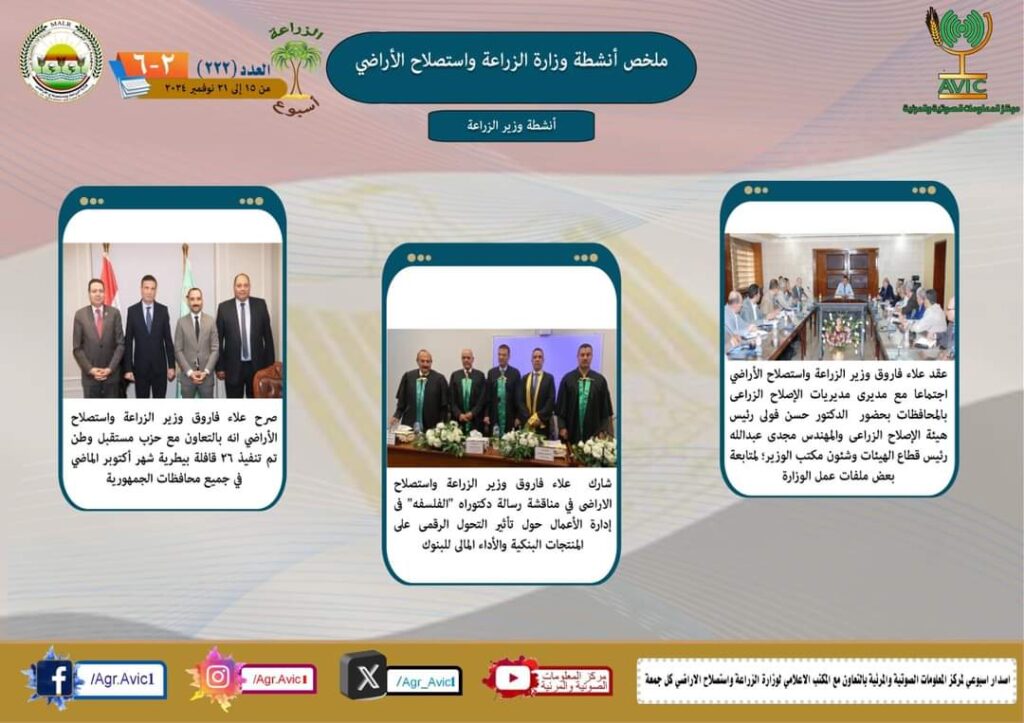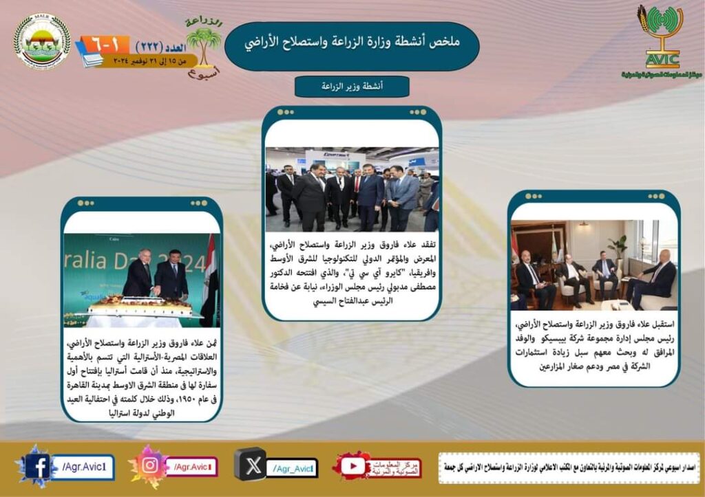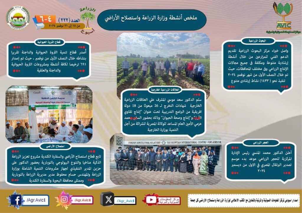 أصدر مركز المعلومات الصوتية والمرئية، التابع لوزارة الزراعة واستصلاح الاراضي، “الانفوجراف الاسبوعي” في نسخته رقم ٢٢٢ حول الحصاد الاسبوعي لأهم أنشطة الوزارة، خلال الاسبوع الماضي في الفترة من ١٥ وحتى ٢١ نوفمبر الجاري، وذلك بالتعاون مع المكتب الاعلامي للوزارة، كما أصدر المركز ايضا ملخصا بالفيديو، حول انشطة الوزارة خلال نفس الفترة.