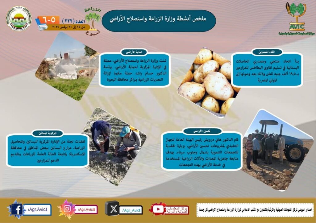 وبدأ اتحاد منتجي ومصدري الحاصلات البستانية في تسليم تقاوى البطاطس للمزارعين بـ 69,5 ألف جنيه للطن وذلك بعد وصولها إلى المواني المصرية، كذلك شنت وزارة الزراعة واستصلاح الأراضي، ممثلة في الإدارة المركزية لحماية الأراضي، برئاسة الدكتور حسام راشد حملة مكبرة لإزالة التعديات الزراعية بمراكز محافظة البحيرة.