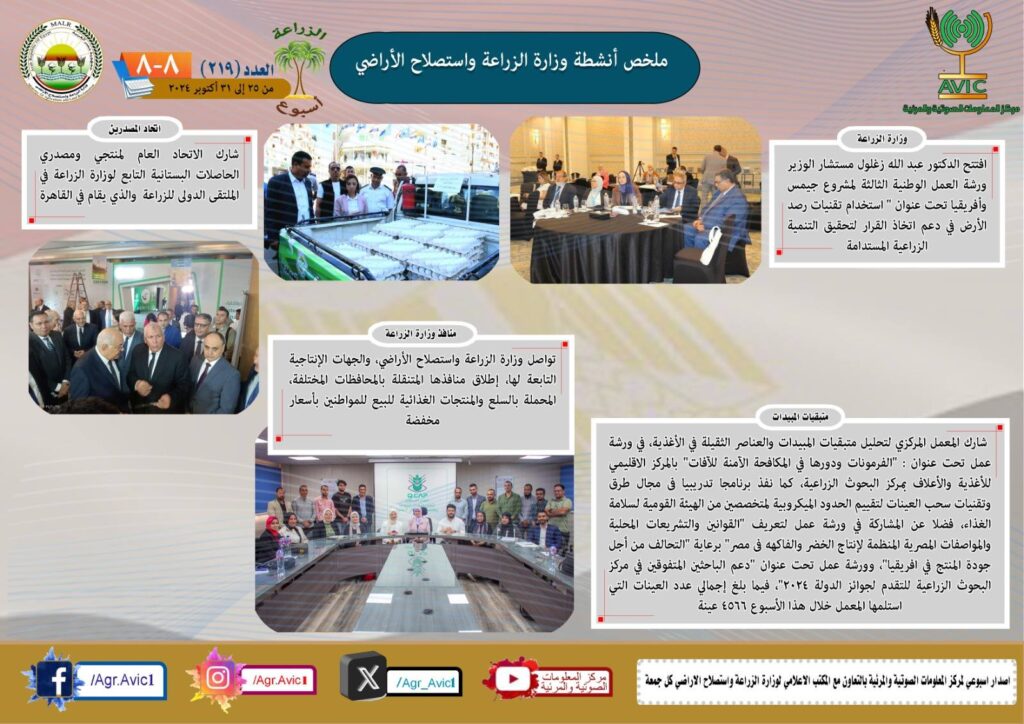 أصدر مركز المعلومات الصوتية والمرئية، التابع لوزارة الزراعة واستصلاح الاراضي، “الانفوجراف الاسبوعي” في نسخته رقم ٢١٩ حول الحصاد الاسبوعي لأهم أنشطة الوزارة، خلال الاسبوع الماضي في الفترة من ٢٥ وحتى ٣١ اكتوبر الجاري، وذلك بالتعاون مع المكتب الاعلامي للوزارة، كما أصدر المركز ايضا ملخصا بالفيديو، حول انشطة الوزارة خلال نفس الفترة.