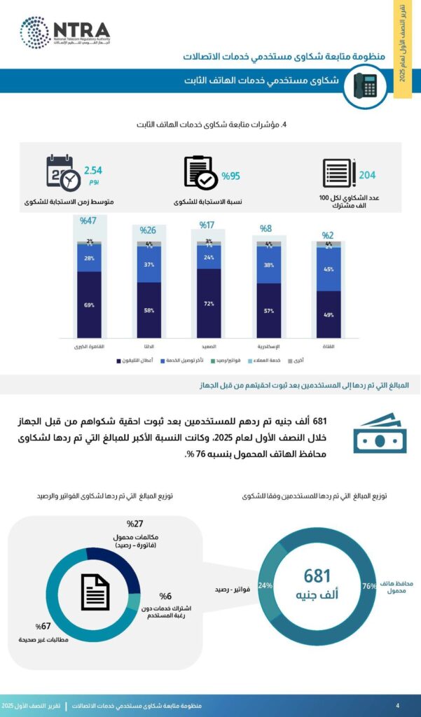 681 ألف جنيه تم ردها للمستخدمين بعد ثبوت أحقية شكواهم من قبل الجهاز خلال النصف الأول لعام 2025، وكانت النسبة الأكبر للمبالغ التي تم ردها لشكاوى محافظ الهاتف المحمول بنسبة 76%.