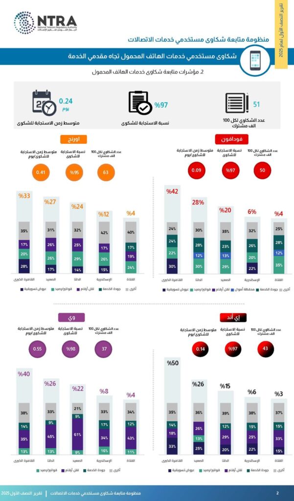 في إطار حرص الجهاز القومي لتنظيم الاتصالات على دعم حقوق المستخدمين وضمان تقديم خدمات اتصالات ذات جودة في السوق المصري، أصدر الجهاز تقرير منظومة متابعة شكاوى مستخدمي خدمات الاتصالات عن النصف الأول لعام 2025، والذي يعرض أهم المؤشرات المتعلقة بشكاوى مستخدمي خدمات الهاتف الثابت والمحمول والإنترنت الثابت وأجهزة التليفون المحمول، ونسبة ووقت الاستجابة لشكاوى العملاء بعد تصعيدها للجهاز القومي لتنظيم الاتصالات.