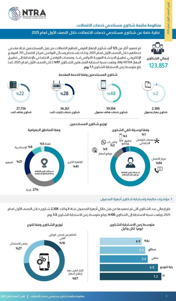 يتلقى الجهاز القومي لتنظيم الاتصالات شكاوى مستخدمي خدمات الاتصالات تجاه مقدمي خدماتهم، عن طريق مركز الاتصال (١٥٥)، بالإضافة إلى وسائل اتصال إلكترونية قام الجهاز بإضافتها لتيسير التواصل مع المستخدمين وإتاحة قنوات غير تقليدية لتلقي الشكاوى مثل تطبيق المحمول الخاص بالجهاز My NTRA، وموقع الجهاز على الإنترنت، والبريد الإلكتروني، وتطبيق الدردشة الفورية (الواتس آب)، مما أسفر عن تلقي 123857 شكوى خلال النصف الأول من عام 2025، وبلغت نسبة استجابة المشغلين للشكاوى خلال العام 97٪، كما بلغ متوسط زمن الاستجابة للشكوى 1.1 يوم، ويعد أهم ما جاء بالتقرير ما يلي: