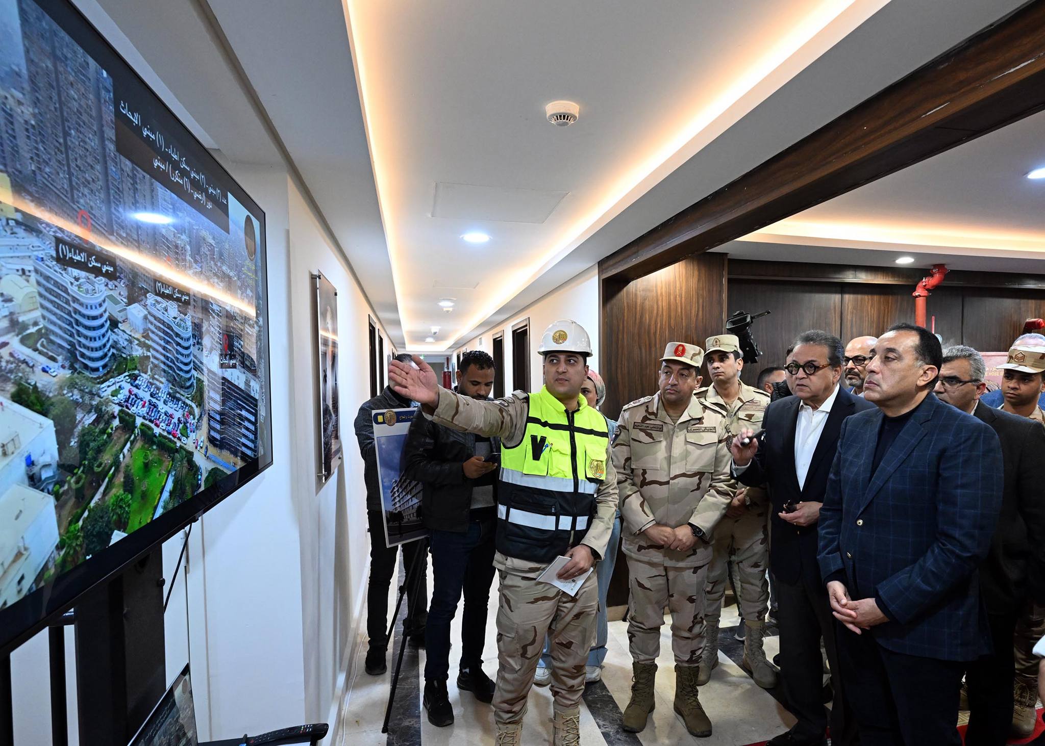 وقال مسئول الهيئة الهندسية لرئيس الوزراء: فيما يتعلق بالموقف التنفيذي للمشروع فقد تم إحلال وتجديد شبكات البنية التحتية بما تتضمن من (كهرباء – مياه وحريق وري وخزان (3000) م3– صرف صحي ومحطة معالجة (1000) م3 –– تيار خفيف)، كما تم تنسيق الموقع العام بما يشمله من (طرق – أرصفة – بردورات – زراعات)، لافتا إلى أنه يتم تكثيف العمل للانتهاء من المشروع وفق المخطط الزمني لكل مراحله؛ حيث من المقرر الانتهاء من الهيكل الخرساني في 30 يونيو المقبل، كما سيتم الانتهاء من مبنى الجراج متعدد الطوابق في مارس المقبل، والذي يسع لانتظار 640 سيارة.