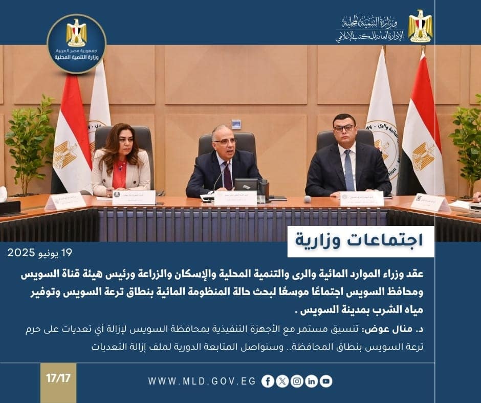 وشاركت الدكتورة منال عوض وزيرة التنمية المحلية، في اجتماع موسع بمقر وزارة الموارد المائية والري بالعاصمة الإدارية، برئاسة الدكتور هانى سويلم وزير الموارد المائية والرى وبحضور عدد من الوزراء والمسؤولين ومحافظ السويس وعدد من السادة قيادات الوزارات والجهات المعنية، لاستعراض حالة المنظومة المائية بنطاق ترعة السويس، وتوفير الإحتياجات المائية بكامل زمام الترعة، وتحقيق المناسيب اللازمة لتشغيل محطات مياه الشرب وخاصة محطة مياه شرب السويس المغذية لمدينة السويس .