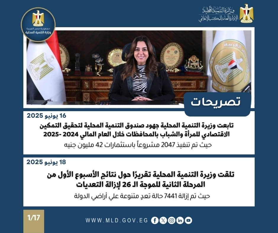 تلقت الدكتورة منال عوض وزيرة التنمية المحلية، تقريرًا مفصلًا من قطاع الإدارة الاستراتيجية والتنمية المحلية بالوزارة حول الجهود التي بذلتها المحافظات بالتعاون مع جهات الولاية وقوات إنفاذ القانون خلال الأسبوع الأول من المرحلة الثانية للموجة الـ26 لإزالة التعديات علي أملاك وأراضي الدولة والأراضي الزراعية،