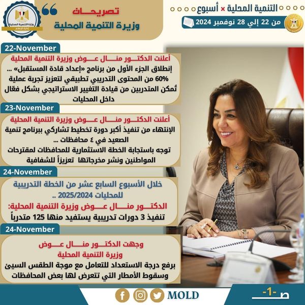 أعلنت الدكتورة منال عوض، وزيرة التنمية المحلية، عن إنطلاق الأسبوع السابع عشر من الخطة التدريبية للمحليات للعام المالي الحالي 2024/2025 الأحد الموافق 24 نوفمبر 2024، بتنفيذ 3 دورات تدريبية هي برنامج ديناميكيات السكان ومؤشرات المتابعة، وبرنامج التقييم والأمن والصحة والسلامة المهنية، فضلاً عن برنامج إعداد قادة المستقبل، ويستفيد من هذه الدورات 125 متدرباً .