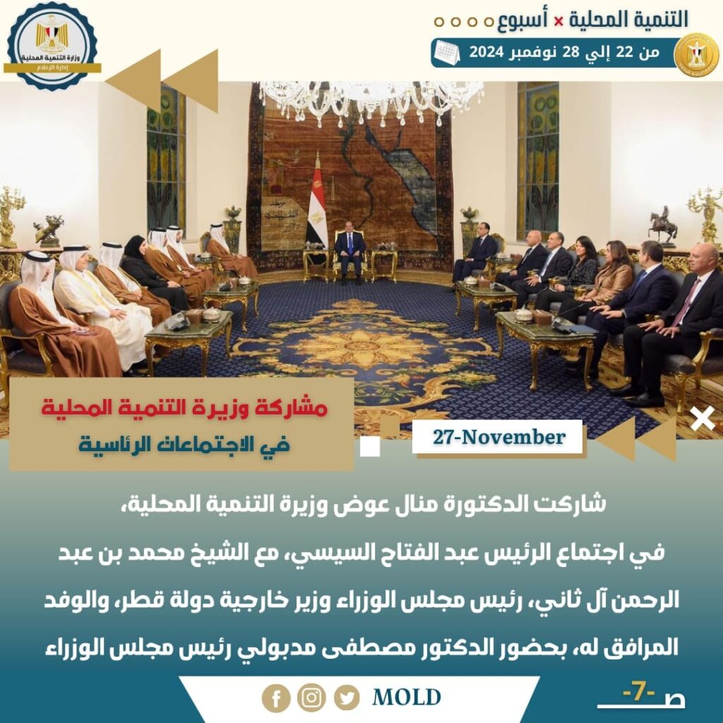 كما شاركت الدكتورة منال عوض، وزيرة التنمية المحلية، في جلسة المباحثات التي ترأسها الدكتور مصطفى مدبولي، رئيس مجلس الوزراء، ومعالي الشيخ/ محمد بن عبد الرحمن بن جاسم آل ثاني، رئيس وزراء قطر، وزير الخارجية، بمقر مجلس الوزراء بالعاصمة الإدارية الجديدة، لمناقشة سبل دعم التعاون المشترك في مختلف المجالات.