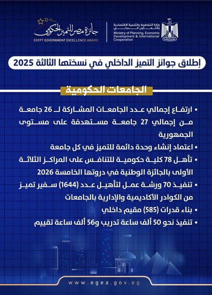 تستعرض وزارة التخطيط والتنمية الاقتصادية والتعاون الدولي؛ حصاد أعمال وأنشطة جائزة مصر للتميز الحكومي لعام 2025، وذلك في إطار سلسلة التقارير التي تصدرها الوزارة لاستعراض حصاد وإنجازات 2025.