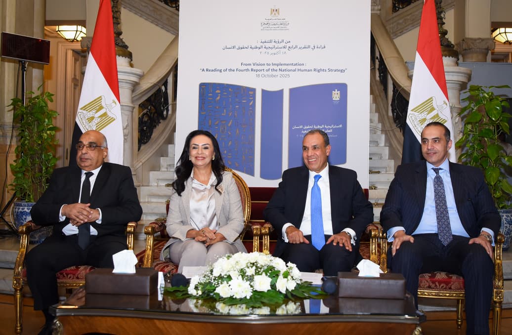 نظمت وزارة الخارجية والهجرة وشئون المصريين بالخارج، مساء السبت ١٨ أكتوبر، ندوة لإطلاق التقرير الرابع لتنفيذ الاستراتيجية الوطنية لحقوق الإنسان، حضرها د. بدر عبد العاطى وزير الخارجية والهجرة وشئون المصريين بالخارج، بصفته رئيس اللجنة العليا الدائمة لحقوق الإنسان، والمستشار عدنان فنجري وزير العدل، والدكتورة مايا مرسي وزيرة التضامن الاجتماعي، والمستشار محمود فوزي وزير الشئون النيابية والقانونية والتواصل السياسي، والنائب طارق رضوان رئيس لجنة حقوق الإنسان بمجلس النواب، والسفير محمود كارم رئيس المجلس القومي لحقوق الإنسان، ورؤساء وممثلي المجالس المختلفة أعضاء اللجنة العليا الدائمة لحقوق الإنسان، وعدد من كبار المسؤولين وممثلى منظمات المجتمع المدني والبعثات الأجنبية في القاهرة.