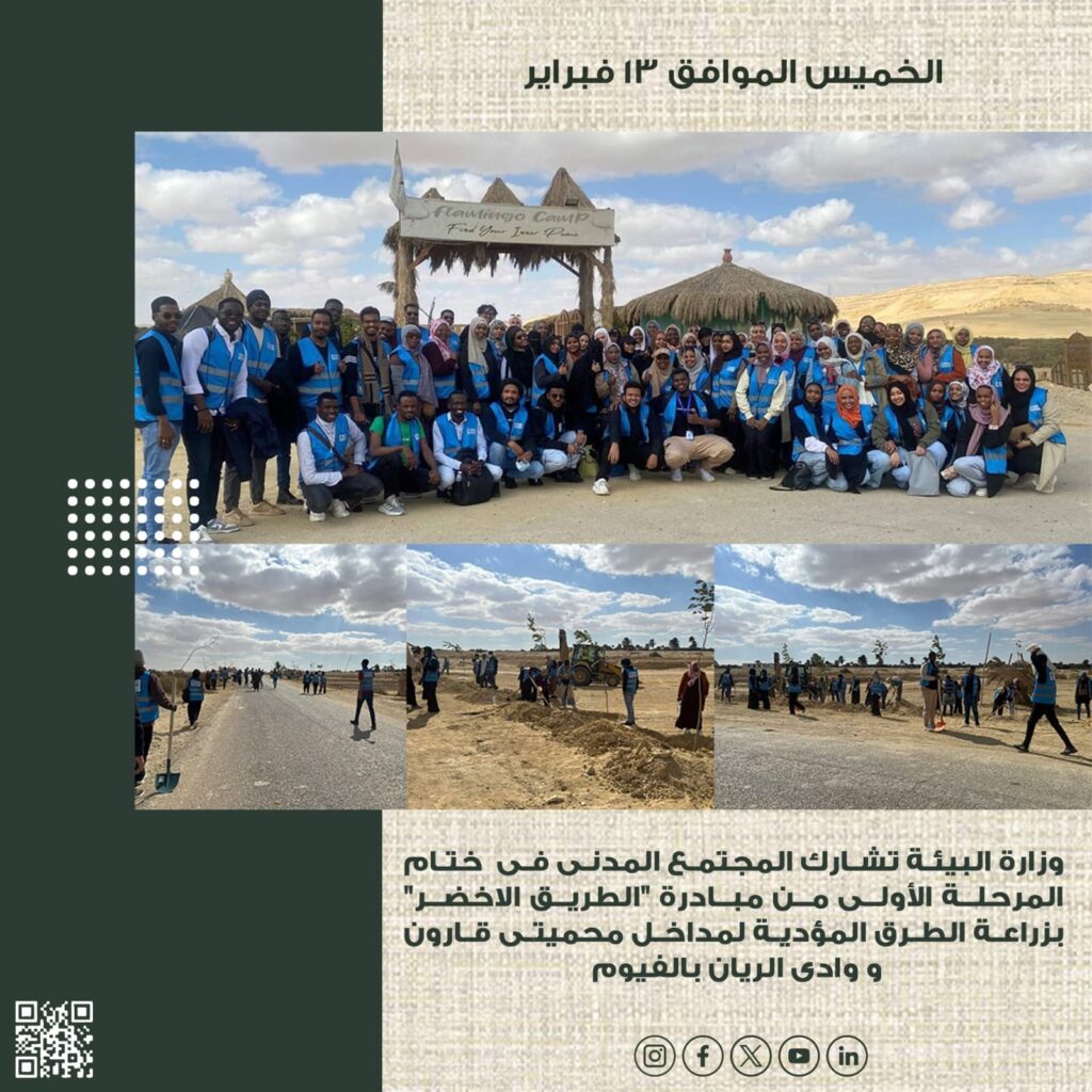 – وزارة البيئة تشارك المجتمع المدنى فى زراعة الطرق المؤدية لمداخل محميتى قارون و وادى الريان بالفيوم، فى اطار ختام المرحلة الأولى من مبادرة “الطريق الاخضر” بزراعة 1,250 شجرة في الطرق المؤدية لمداخل المحميات الطبيعية .