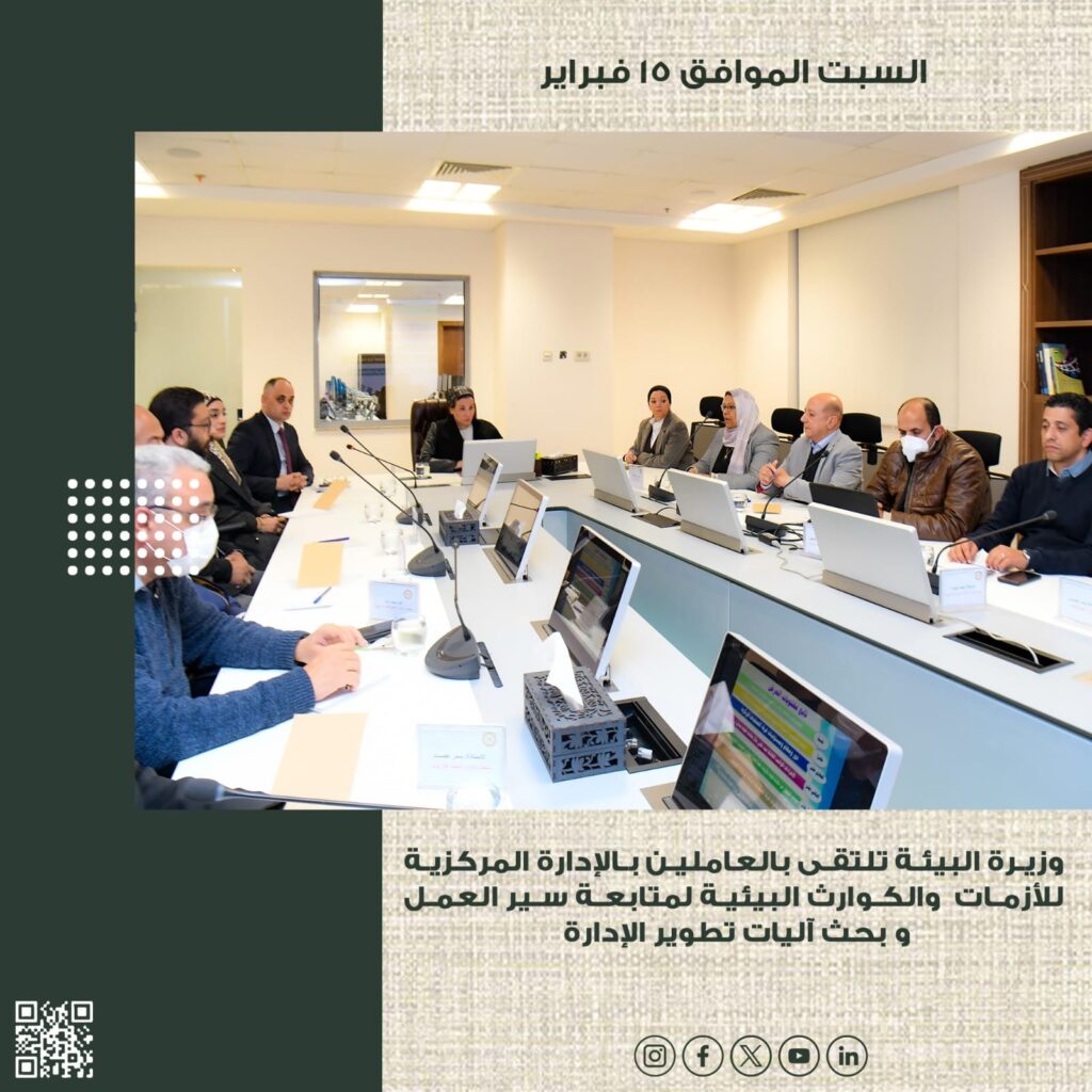 – وزيرة البيئة تلتقى بالعاملين بالإدارة المركزية للأزمات والكوارث البيئية لمتابعة سير العمل و بحث آليات تطوير الأداء وتحسين بيئة العمل…وتوجه بضرورة  تحديث الدليل الإرشادى لخطة الطوارئ الوطنية وغرفة العمليات المركزية .