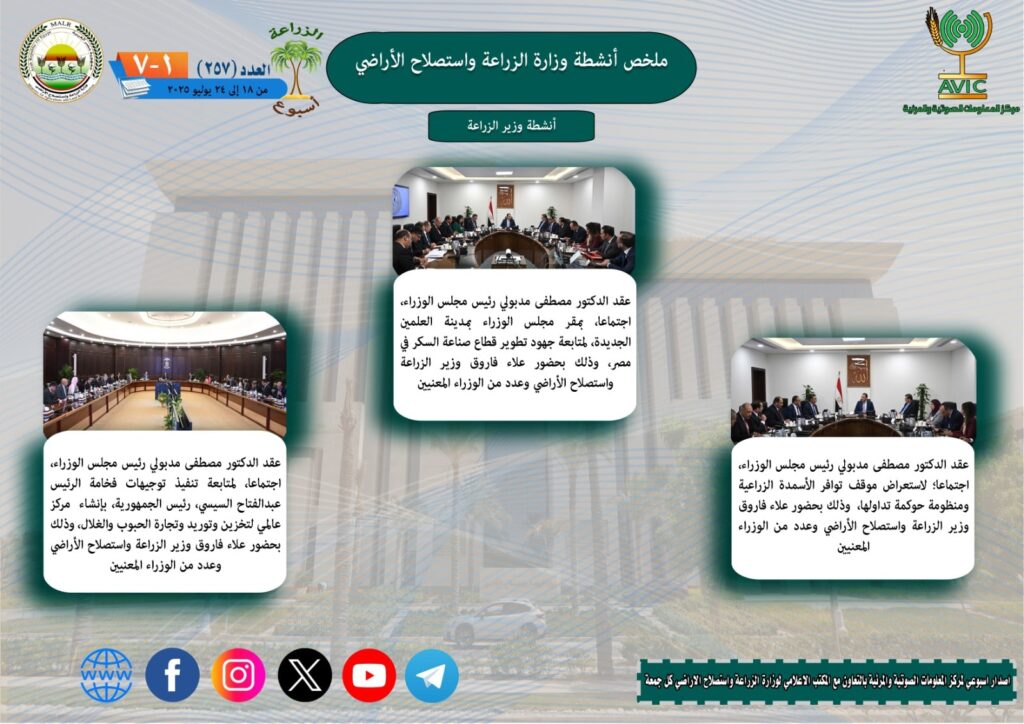 يذكر ان مركز المعلومات الصوتية والمرئية، والمكتب الاعلامي للوزارة، يصدران الجمعة من كل اسبوع، انفوجرافا وفيديو باسم: الزراعة في اسبوع، لالقاء الضوء على ملخص ما تم من انشطة وجهود، بكافة القطاعات والهيئات، التابعة للوزارة، فضلا عن انفوجراف وفيديو كل ثلاثاء باسم: الزراعة في كل مصر، حول انشطة وجهود القطاع الزراعي، بالمحافظات المختلفة.